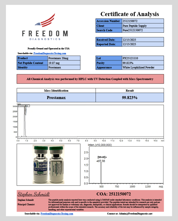 Prostamax 20mg in lyophilized powder format in a sterile 3ml vial.